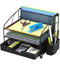 SIMPLE HOUSEWARE Mesh Desk Organizer with Sliding Drawer, Double Tray and 5 Upright Sections, Black