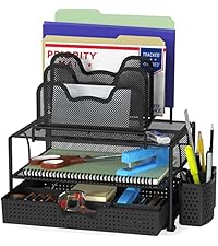 Combines upright file slots, horizontal trays, pen holder, and drawer to keep everything in one tidy place.